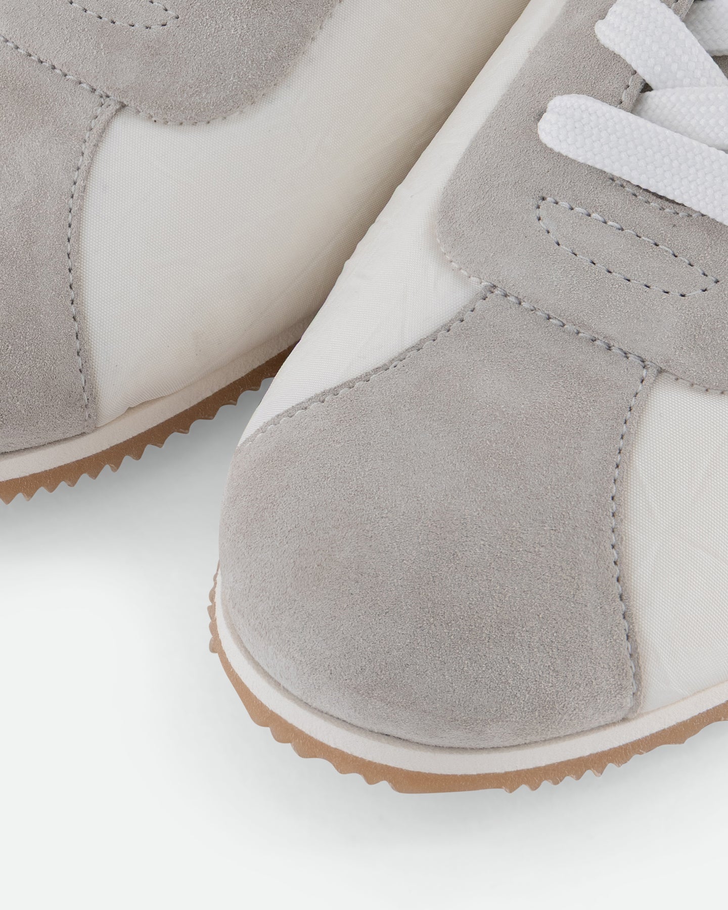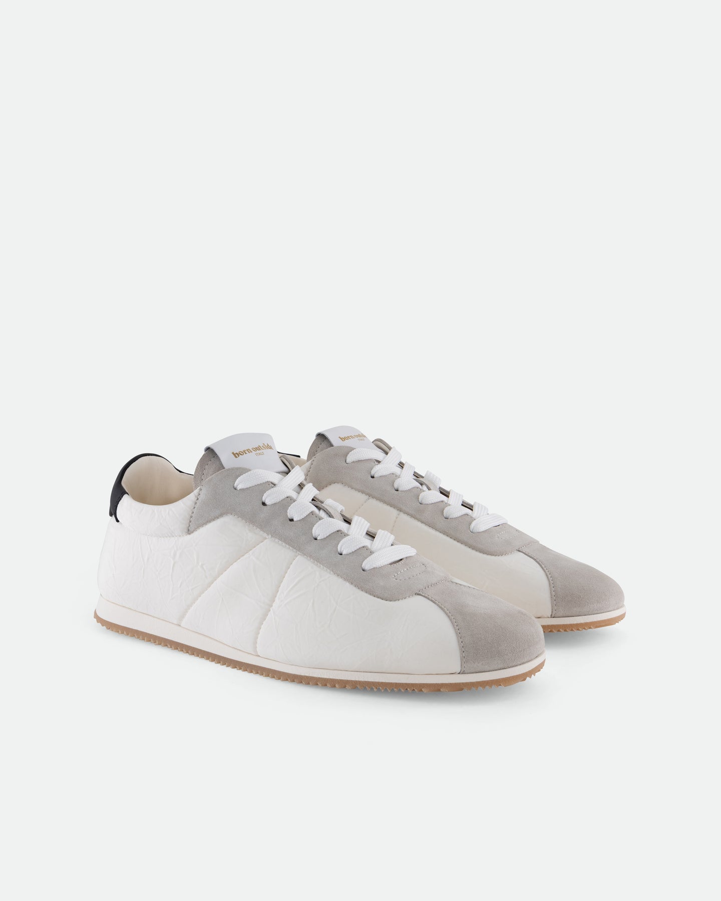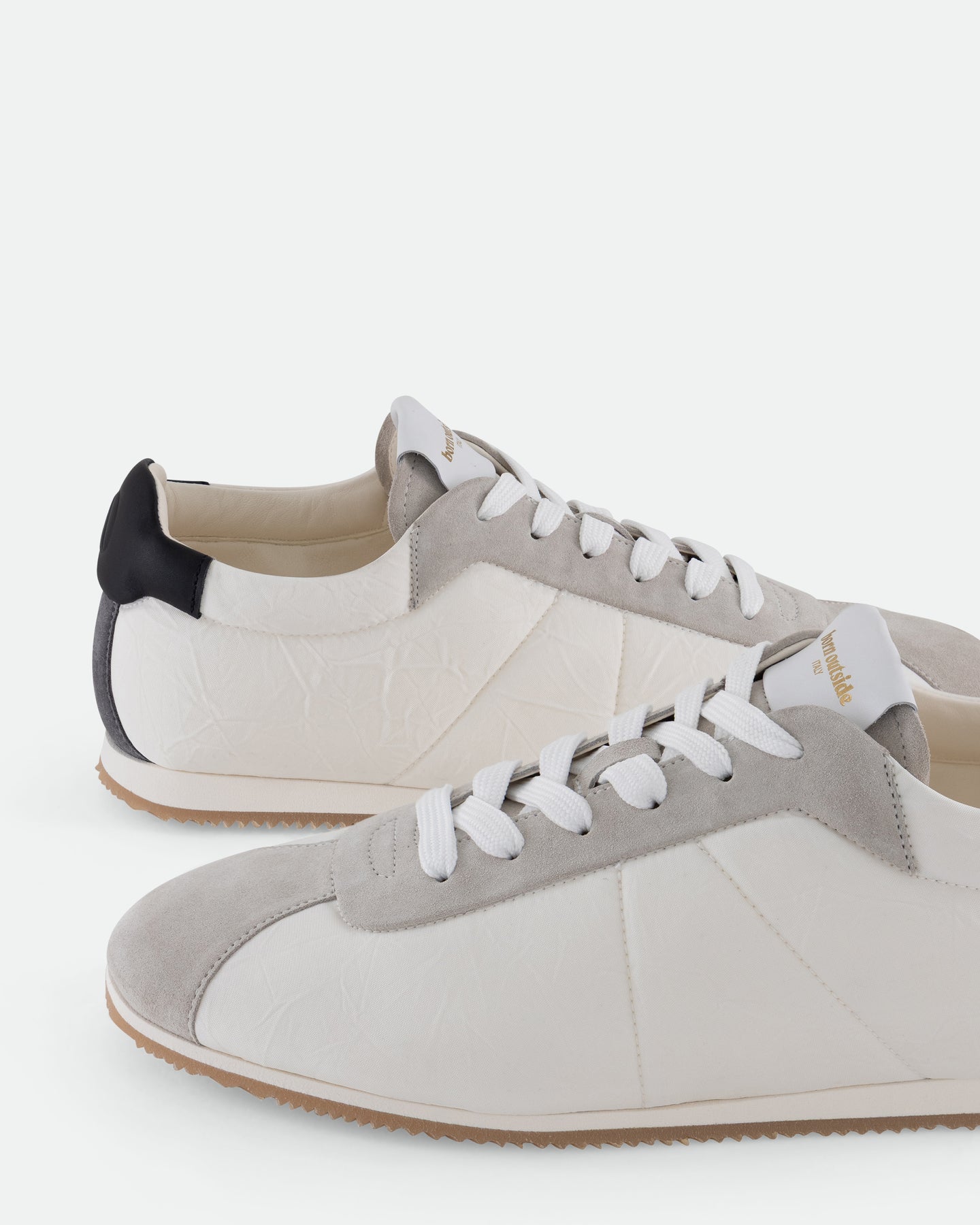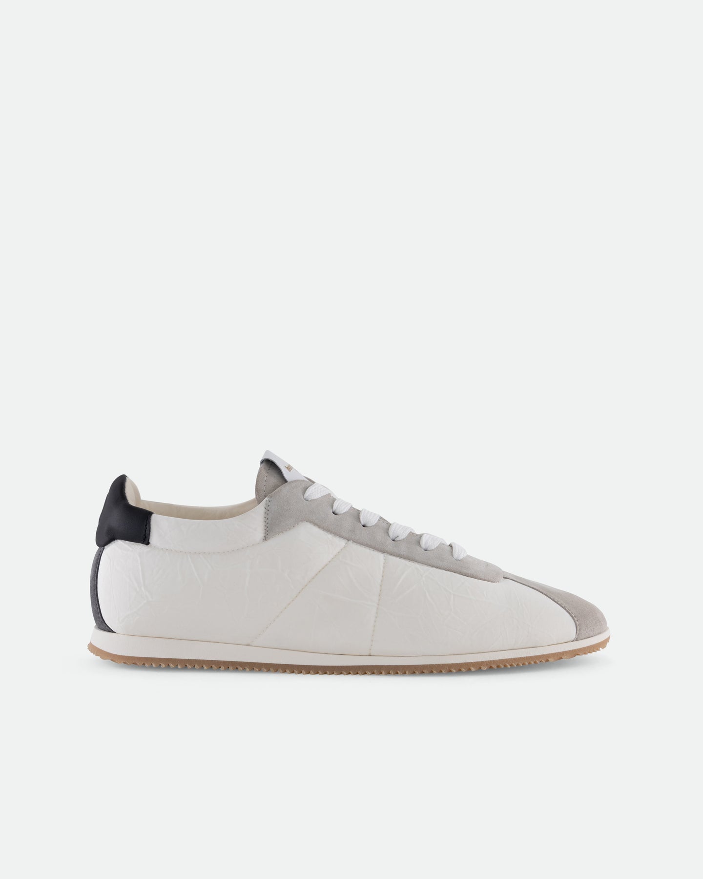 A stripped-back runner reimagined for everyday wear. SNK005 uses creased nylon for a crinkled, weightless feel and visual edge. Contrast accents and mixed materials add punch and personality. Minimal structure, maximum character. Engraved logo on a loop leather insert on the tongue.